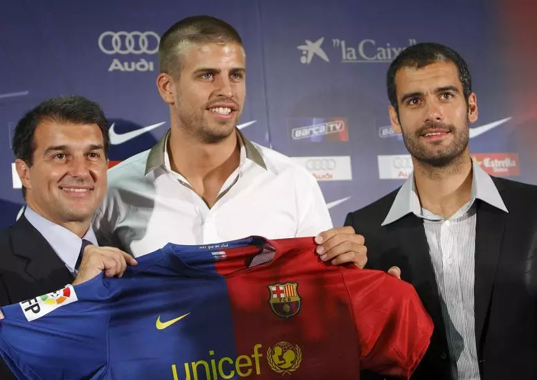 Gerard Piqué, amb Joan Laporta i Pep Guardiola el dia de la presentació com a nou jugador del Barça. El central, avalat pel seu pas a la Masia, tornava amb el rol de suplent però ben aviat es faria un lloc a l'onze titular. TONI GARRIGA / EFE