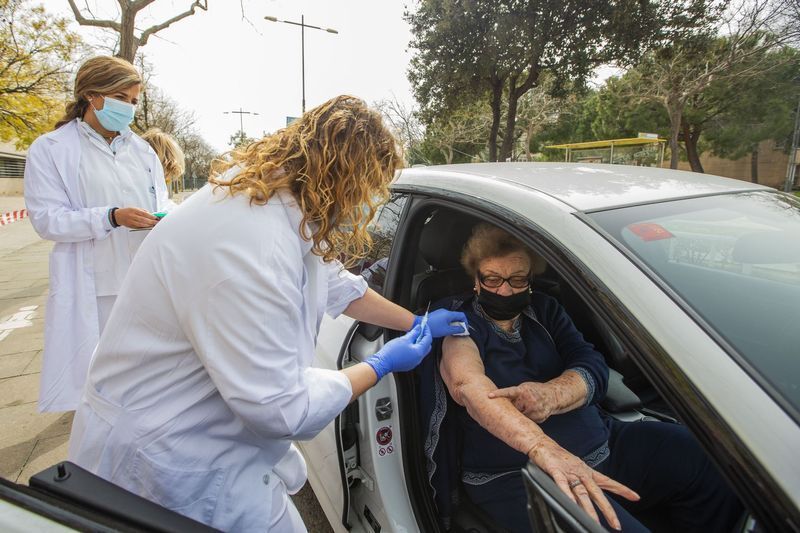 Una dona es vacuna contra el covid des de dins d'un cotxe, al CAP Can Bou de Castelldefels, a l'inici de la campanya de vacunació massiva.