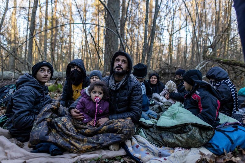 Membres d'una família kurda de l'Iraq en un bosc prop de la frontera entre Polònia i Bielorússia mentre esperen poder passar a Polònia, el 9 de novembre del 2021. La família, de setze membres, set dels quals menors d'edat, van passar uns vint dies al bosc i finalment van ser expulsats de Bielorússia.