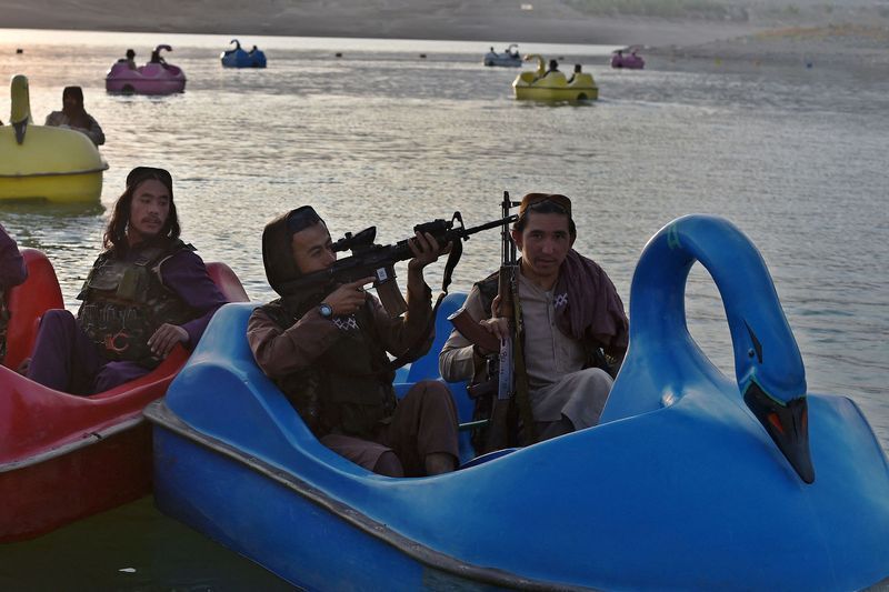 En aquesta fotografia feta el 28 de setembre del 2021, un grup de combatents talibans passegen en vaixells de rem al llac Qargha, als afores de Kabul. "Això és l'Afganistan!", cridaven els talibans mentre disfrutaven del dia festiu en un atrotinat recinte firal a l'oest de Kabul.