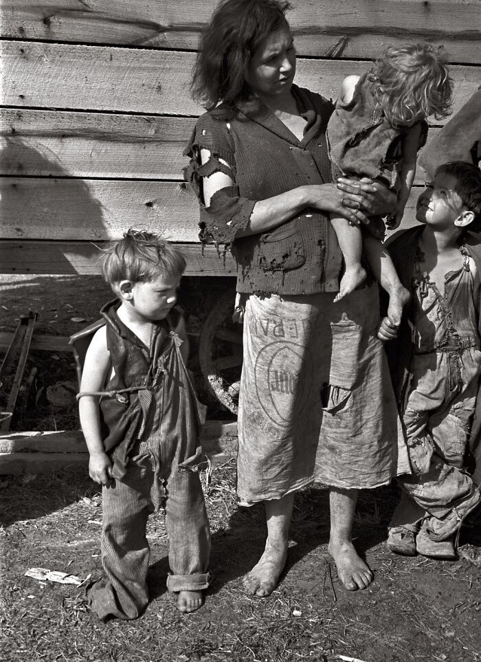 #24 Una madre y su bebé, parte de una familia de nueve que vivía en el campo en la ruta estadounidense 70, cerca del río Tennessee. Marzo de 1936