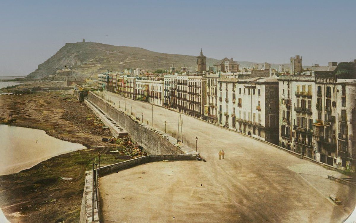 Muralla del mar de Barcelona el 1874, pocs anys abans de ser enderrocada per construir-hi l'actual Passeig de Colom, i unir a la ciutat el barri de la Barceloneta, que quedava fora muralla.