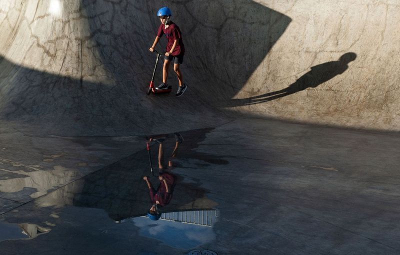 Un noi practica amb el seu patinet a l'skatepark de Sant Francesc després de l'aiguada que va caure a primera hora de la tarda