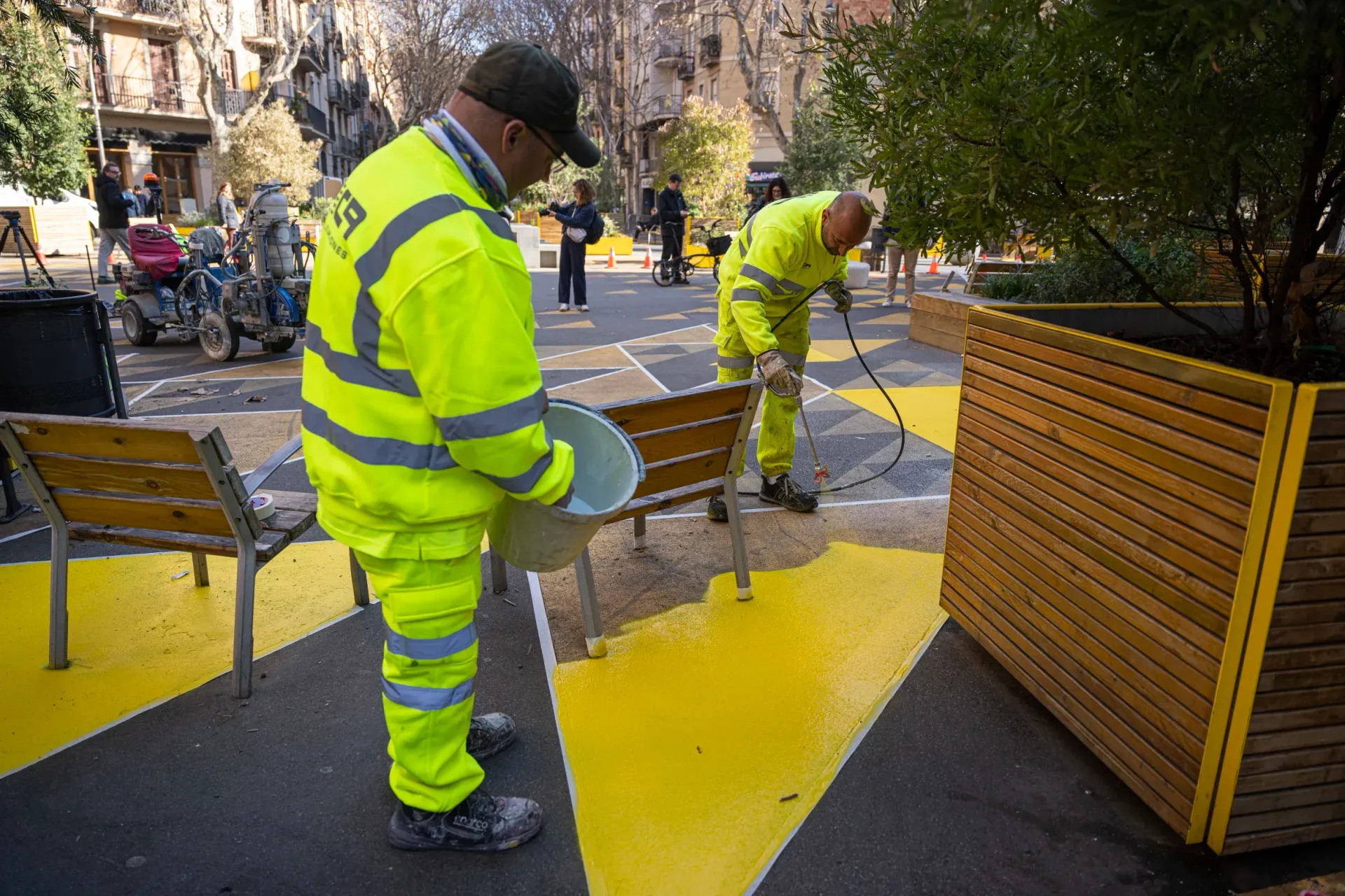 14/02/2023 - Tasques de repintat a la superilla de Sant Antoni, a la cruïlla dels carrers Comte Borrell i Parlament, a l'espera d'un projecte definitiu / Foto: Pau de la Calle