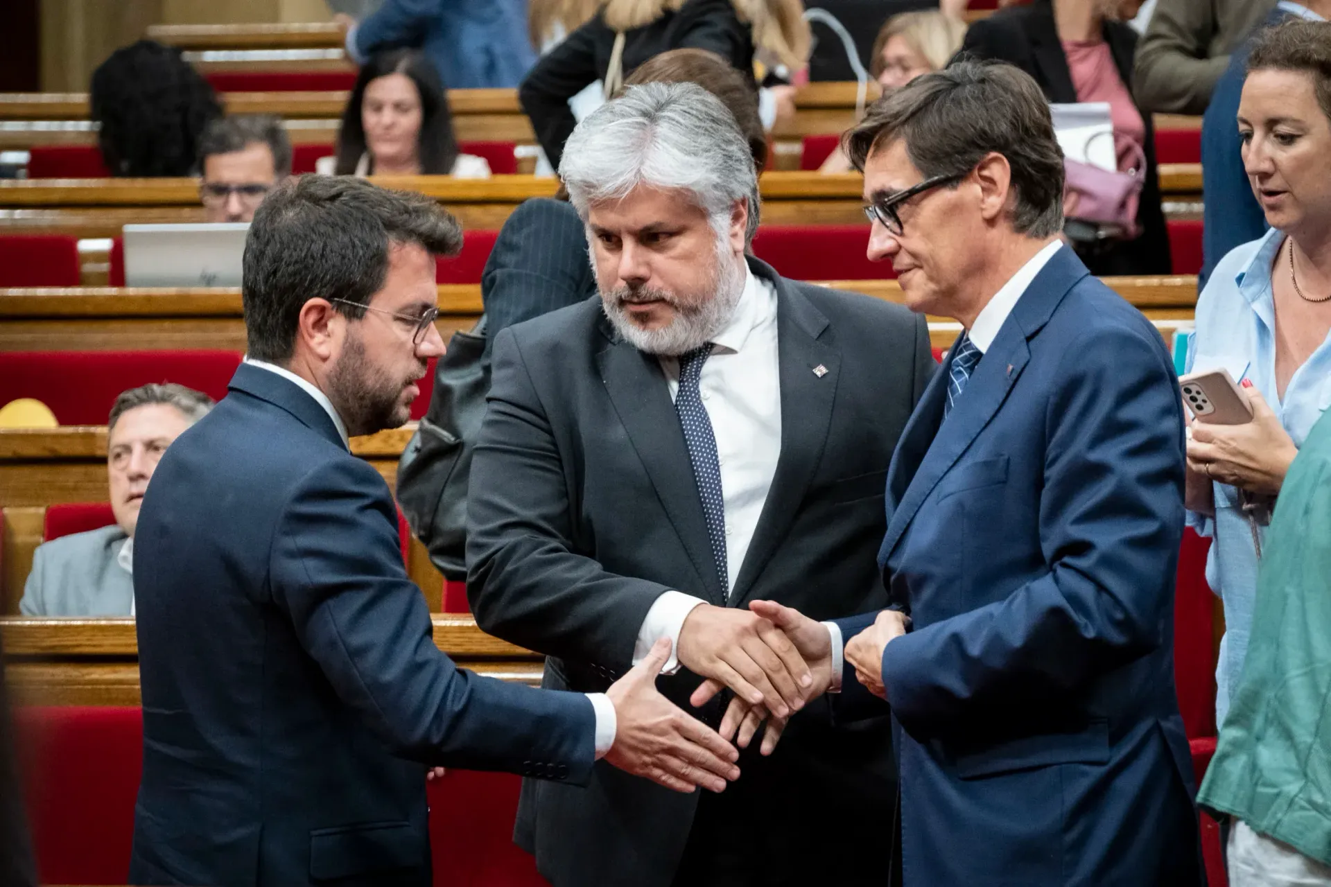 01/02/2023 - Pere Aragonès i Salvador Illa encaixen mans després de l’acord entre el Govern de la Generalitat de Catalunya i el PSC per aprovar el projecte de llei de pressupostos de la Generalitat de Catalunya per a l’any 2023 / Foto: Carlos Baglietto