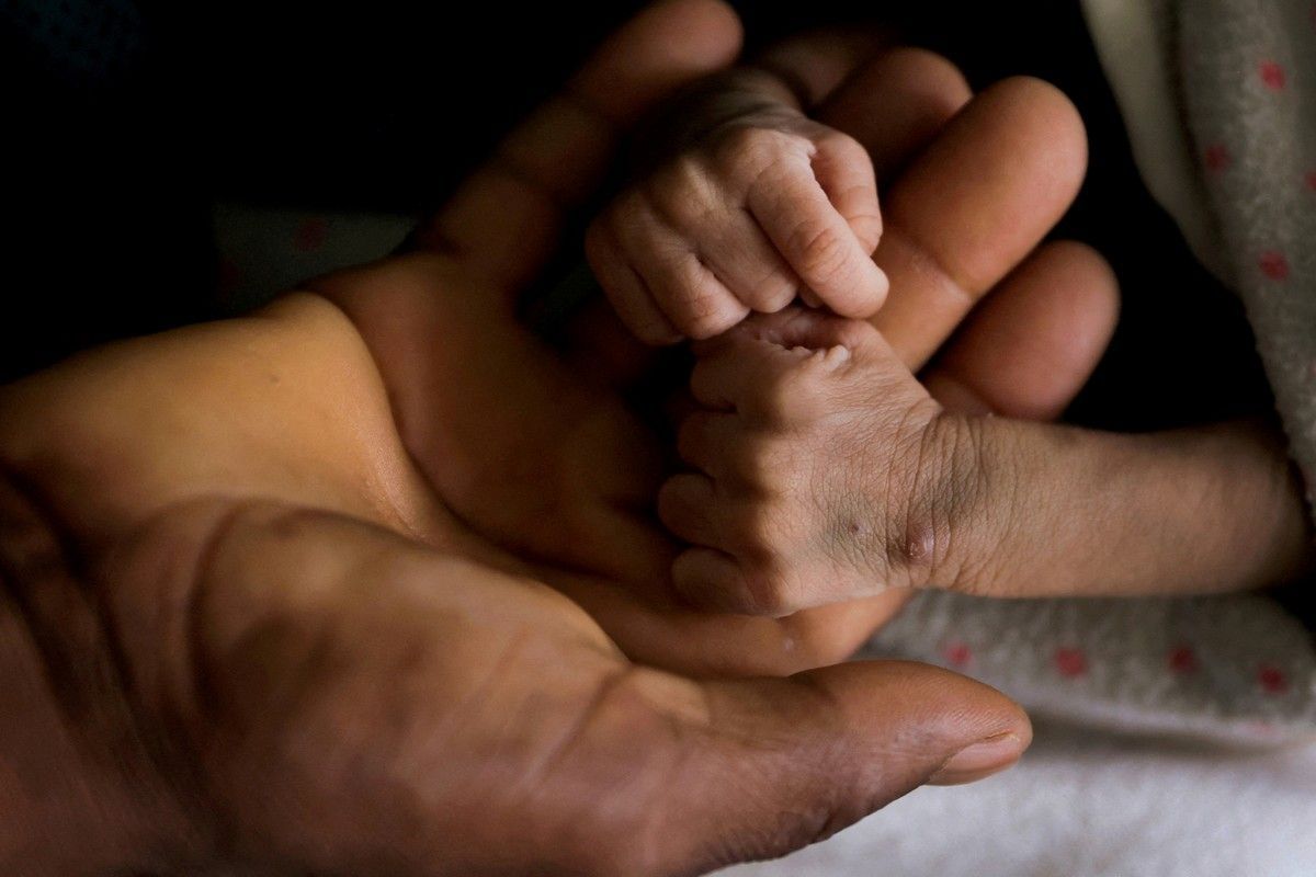 Woldegebrial Abadi, de 36 años, sostiene las manos de su hijo recién nacido gravemente desnutrido, Berhanu Woldegebrial, en el Hospital Samre, en Samre, región de Tigray, Etiopía, el 23 de junio de 2023. Foto: REUTERS/Tiksa Negeri