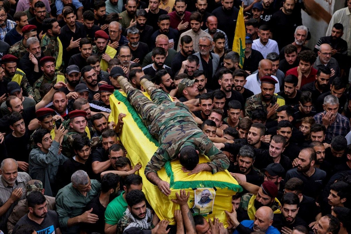 Nazih, hijo del miembro de Hezbollah, Mounir Youssef Achour, quien fue asesinado en el sur del Líbano en medio de tensiones entre Israel y Hezbollah, yace encima del ataúd de su padre mientras lo llora durante su funeral, en Chaqra, Líbano, el 30 de octubre de 2023. Foto: REUTERS/Zohra Bensemra
