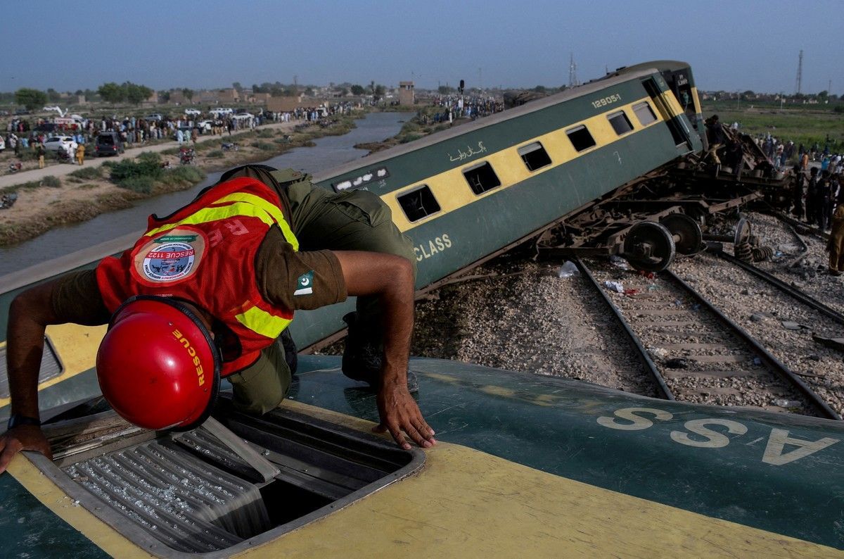 Un trabajador de rescate busca víctimas después de que un tren descarrilara en la ciudad de Sarhari en el distrito de Sanghar, Pakistán, 6 de agosto de 2023. Foto: REUTERS/Yasir Rajput
