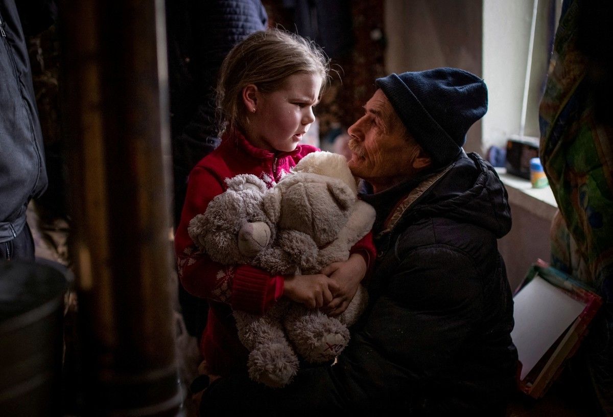 Un abuelo abraza a su nieta Arina, de 6 años, mientras se despide antes de su evacuación de la ciudad fronteriza de Bakhmut, en medio del ataque de Rusia a Ucrania, en la región de Donetsk, Ucrania, el 31 de enero de 2023. Foto: REUTERS /Oleksandr Ratushniak