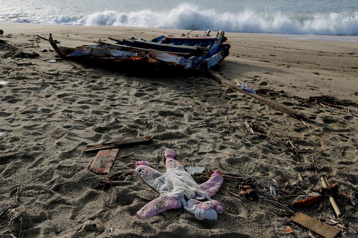 Un trozo del barco y una prenda de vestir del mortal naufragio de migrantes se ven en Steccato di Cutro, cerca de Crotone, Italia, el 28 de febrero de 2023. Foto: REUTERS/Remo Casilli