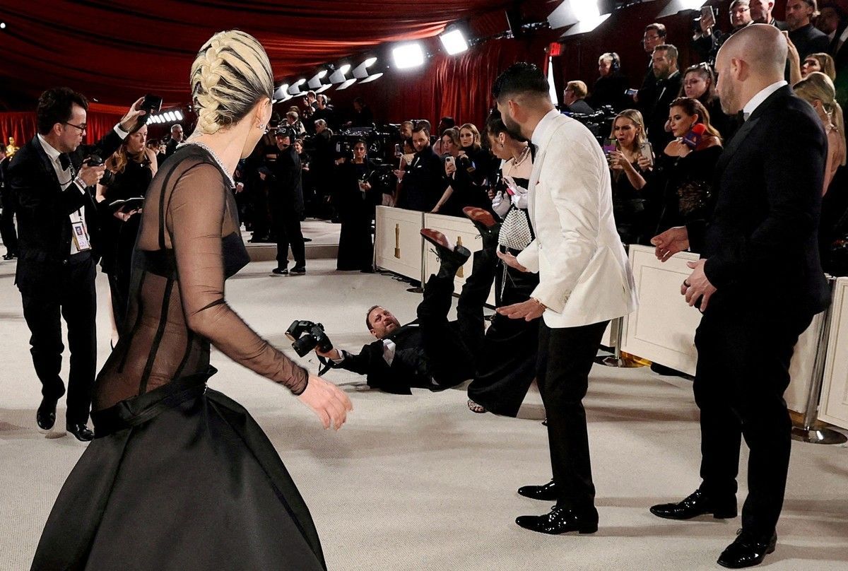 Lady Gaga reacciona mientras un fotógrafo cae sobre la alfombra roja color champán durante las llegadas de los Oscar a los 95º Premios de la Academia en Hollywood, Los Ángeles, California, EE. UU., el 12 de marzo de 2023. Foto: REUTERS/Mario Anzuoni