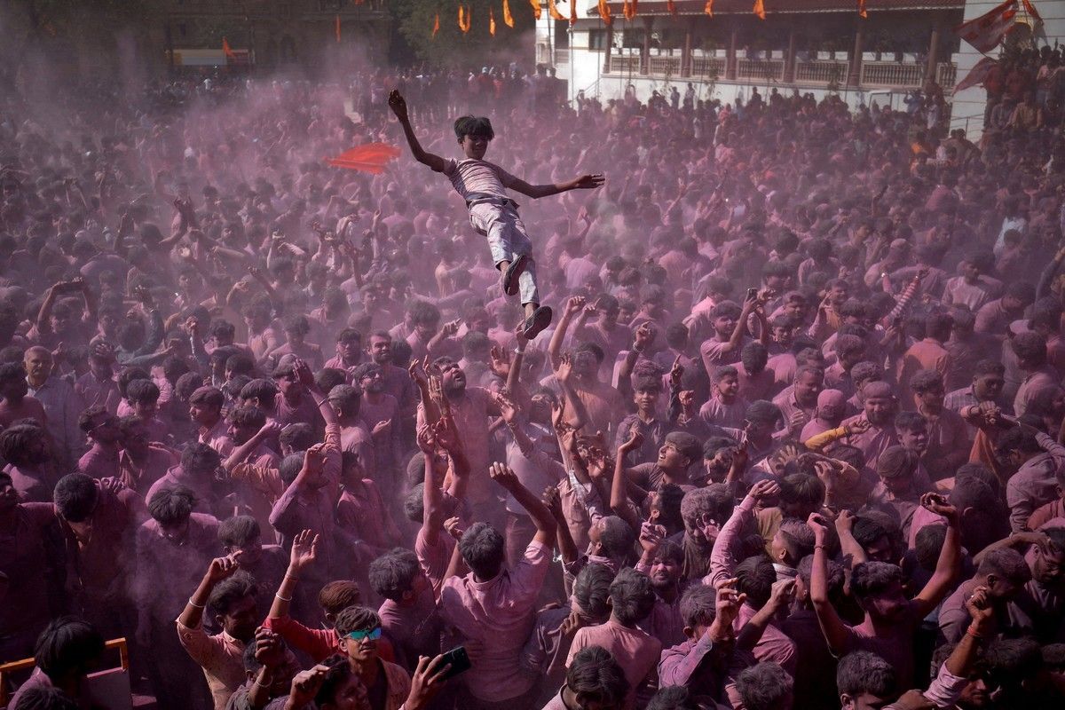 Devotos hindúes pintados de colores lanzan a un compañero devoto al aire mientras celebran Holi, el festival de los colores, en las instalaciones de un templo en Salangpur, en el estado occidental de Gujarat, India, 7 de marzo de 2023. Foto: REUTERS/Amit Dave