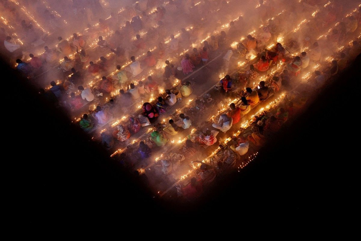 Devotos hindúes se sientan juntos en el suelo de un templo con lámparas de aceite, rezando a Lokenath Brahmachari, un santo hindú, mientras observan a Rakher Upabash, en Narayanganj, Bangladesh, el 7 de noviembre de 2023. Foto: REUTERS/ Mohammad Ponir Hossain
