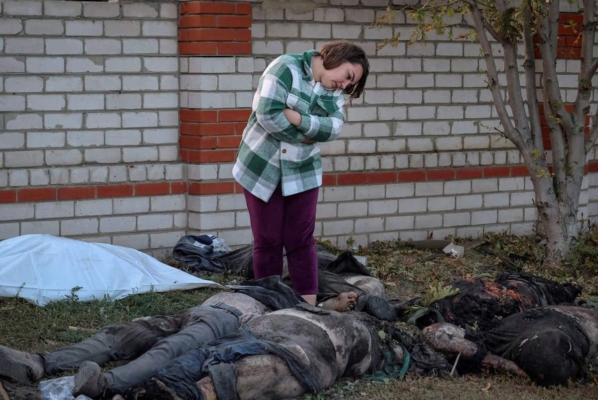 MATERIAL SENSIBLE. Un residente local mira los cadáveres en el lugar de un ataque militar ruso, mientras expertos policiales trabajan en la aldea de Hroza, en la región de Kharkiv, Ucrania, el 5 de octubre de 2023. Foto: REUTERS/Vyacheslav Madiyevskyy
