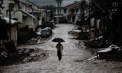 Un hombre con un paraguas camina por una calle parcialmente destruida después de las inundaciones en Mucum, estado de Rio Grande do Sul, Brasil, 11 de mayo de 2024. Foto: REUTERS/Adriano Machado