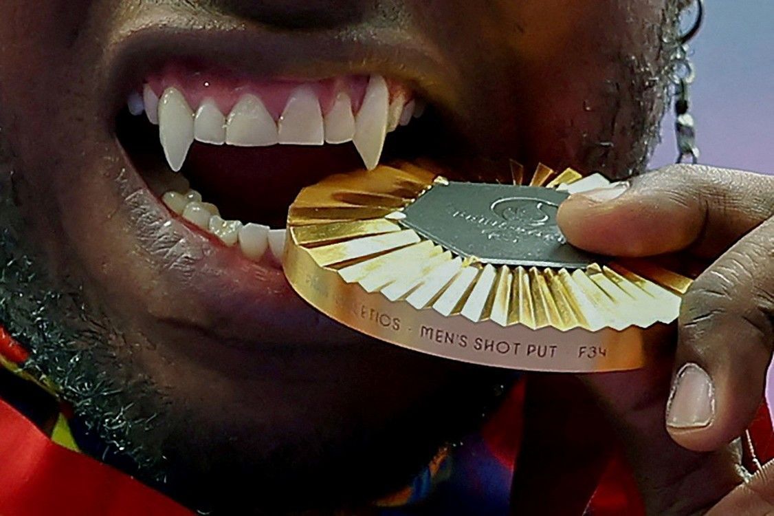 El medallista de oro en atletismo Mauricio Valencia de Colombia muerde su medalla en el podio durante los Juegos Paralímpicos París 2024, 7 de septiembre de 2024. Foto: REUTERS/Umit Bektas