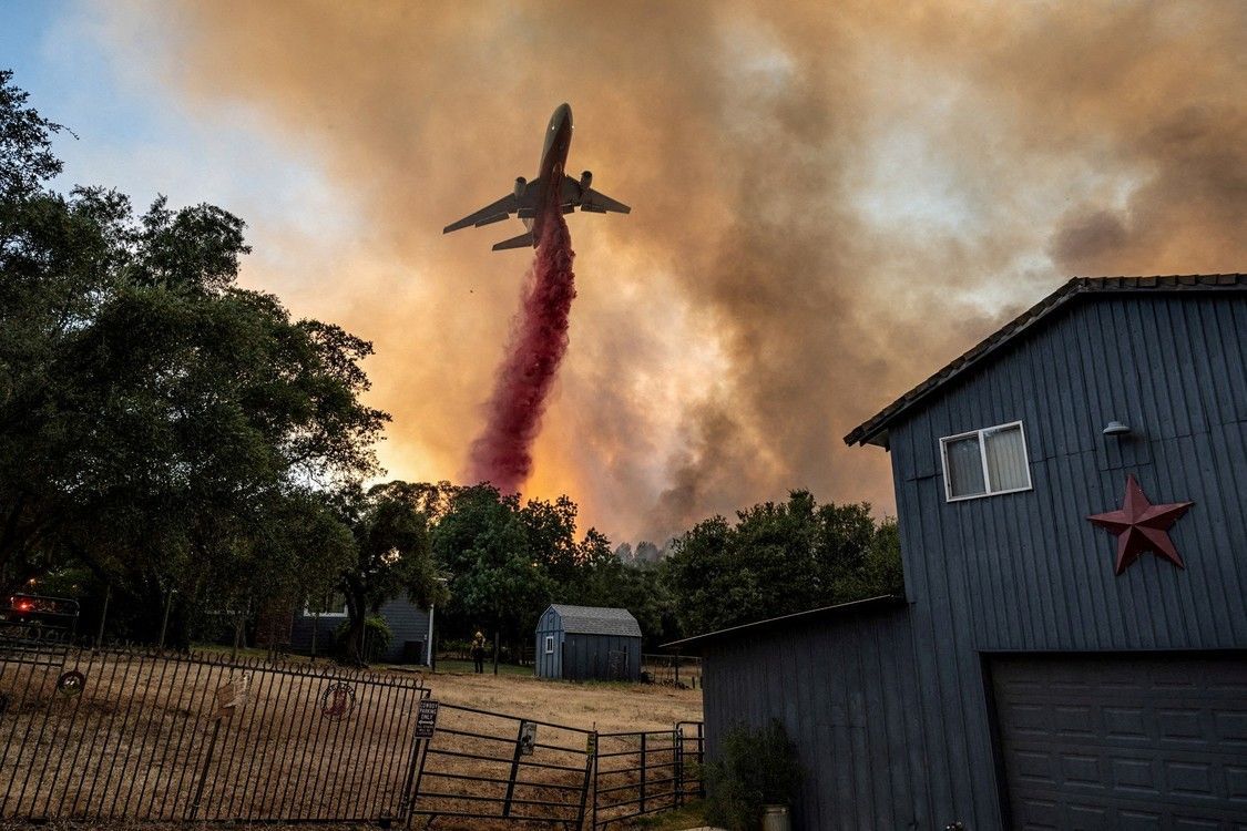 Bomberos arrojan retardante desde un avión junto a una casa mientras luchan contra un incendio forestal en un cañón en Oroville, California, Estados Unidos., 2 de julio de 2024. Foto: REUTERS/Carlos Barira