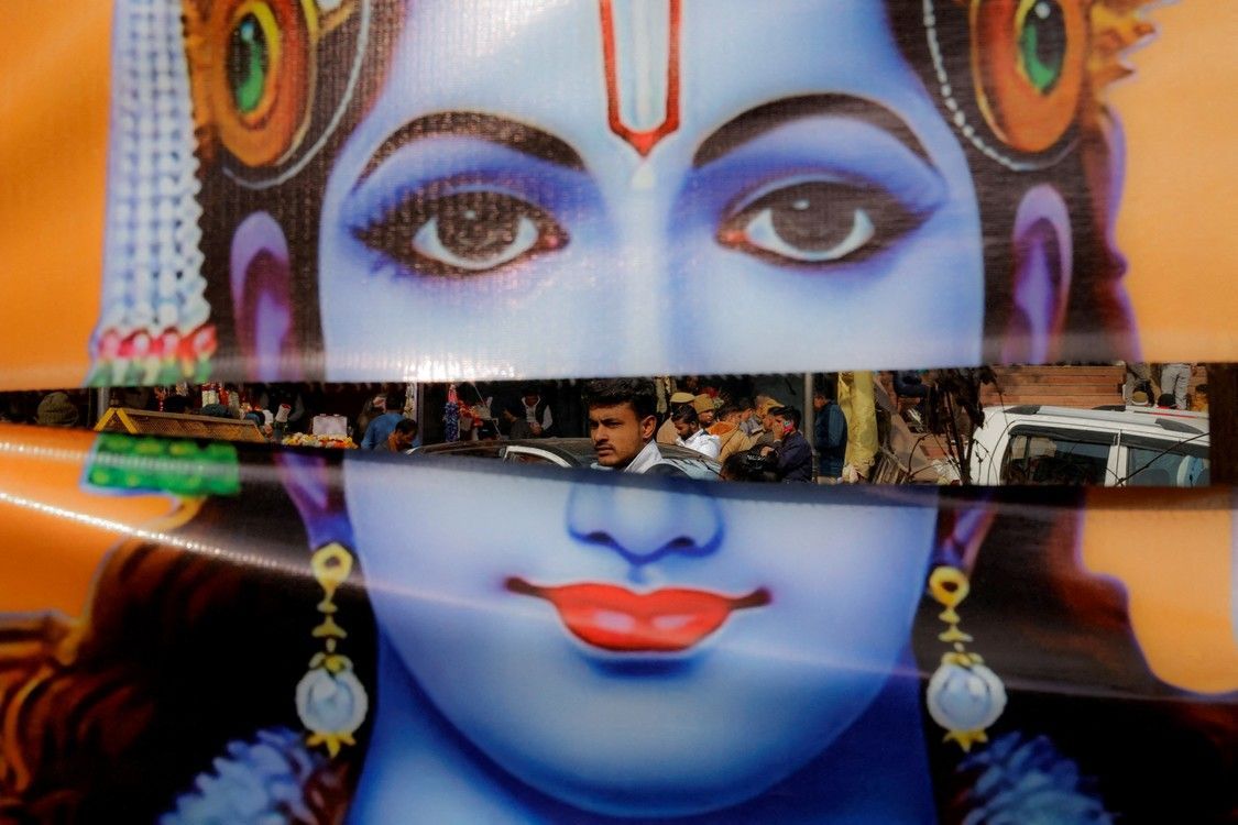 Un hombre pasa junto a un cartel roto que representa a Lord Ram en el casco antiguo de Delhi, India, 21 de enero de 2024. Foto: REUTERS/Anushree Fadnavis