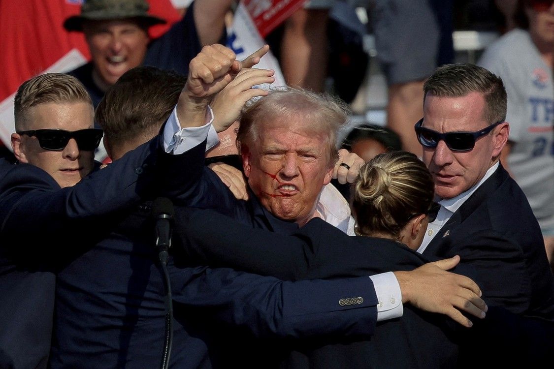 El candidato presidencial republicano y ex presidente estadounidense Donald Trump es asistido por el Servicio Secreto después de que se produjeron disparos durante un mitin de campaña en el Butler Farm Show en Butler, Pensilvania, Estados Unidos, el 13 de julio de 2024. Foto: REUTERS/Brendan McDermid