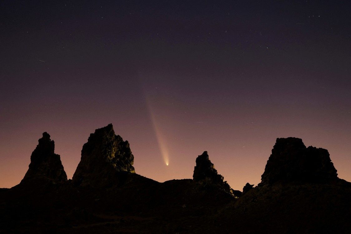 El cometa Tsuchinshan-ATLAS, C/2023, con una órbita de 80.000 años, pasa detrás de formaciones geológicas y agujas de toba en Trona Pinnacles, California, Estados Unidos, 12 de octubre de 2024. Foto: REUTERS/David Swanson