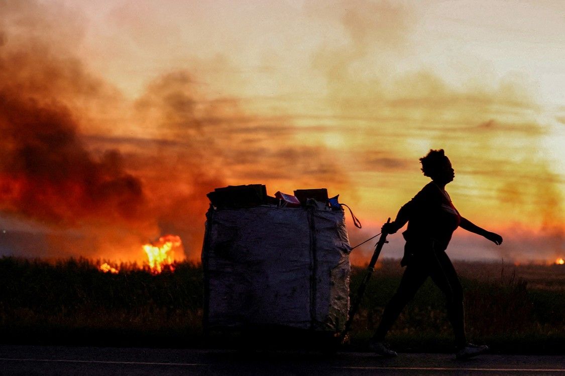 Una mujer tira de un carrito con material reciclable junto a los incendios de veld que se producen a medida que se acerca el invierno, en Lenasia, en el sur de Johannesburgo, Sudáfrica, el 22 de abril de 2024. Foto: REUTERS/Siphiwe Sibeko