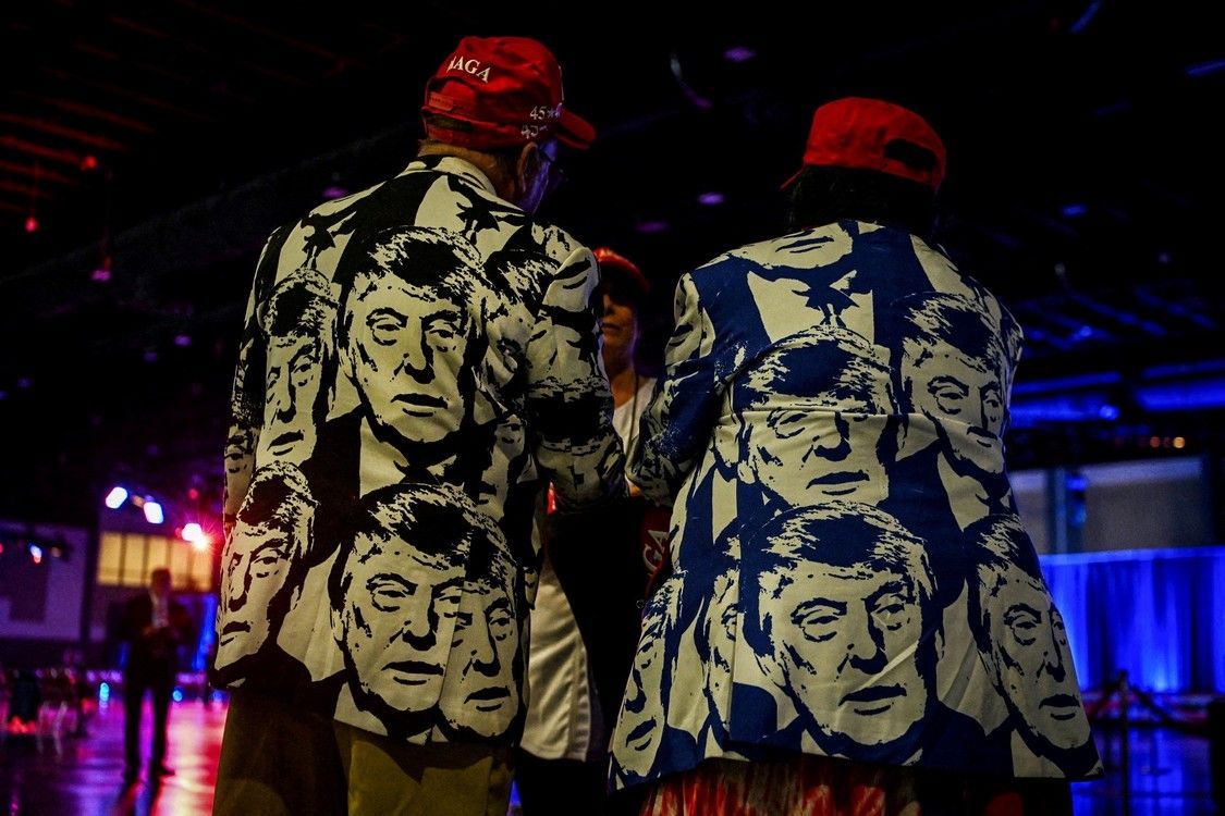 Asistentes visten trajes temáticos de Trump delante del candidato presidencial republicano en el Centro de Convenciones de Palm Beach, en West Palm Beach, Florida, Estados Unidos, 5 de noviembre de 2024. Foto: REUTERS/Callaghan o'Hare