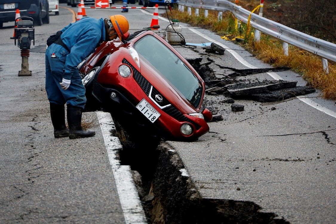 Un trabajador mira un automóvil atrapado en una ruta rota después de un terremoto, cerca de Anamizu, Japón, el 3 de enero de 2024. Foto: REUTERS/Kim Kyung-Hoon