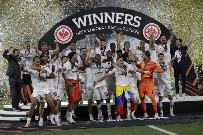 18/05/2022. Els jugadors de l'Eintracht Frankfurt celebren amb el trofeu, després de vèncer el Glasgow Rangers a la final de la Lliga Europa disputada a l'estadi Ramón Sánchez-Pizjuán, a Sevilla. / Foto: Julio Muñoz.