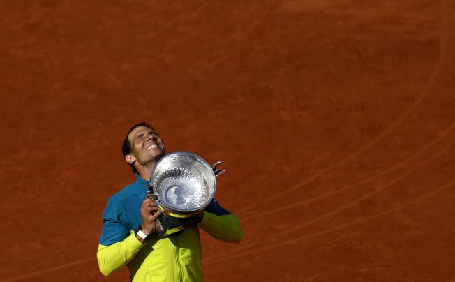 05/06/2022. L'espanyol Rafael Nadal celebra la victoria amb el trofeu La Coupe des Mousquetaires després d'imposar-se al noruec Casper Ruud en el seu partit final de Menís Singles durant l'Open de França de tennis a Roland Garros de París. / Foto: Yoan Valat.