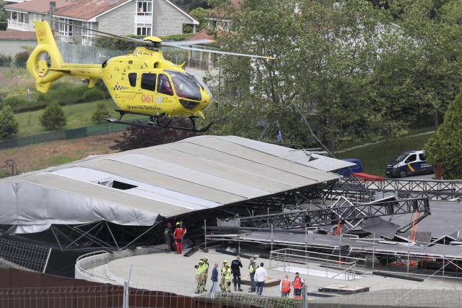 10/06/2022. Diversos treballadors han quedat atrapats en desplomar-se un dels escenaris del festival musical 'O Son do Camiño' que estava sent muntat al Monte do Gozo, a Santiago de Compostel·la. A la imatge, un helicòpter evacua un ferit. / Foto: Xóan Rey.