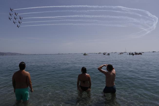11/09/2022. Patrulla de la força aèria suïssa durant la celebració del VI Festival Aeri Internacional de Torre del Mar que compta amb la participació de 43 aeronaus. / Foto: Jorge Zapata.