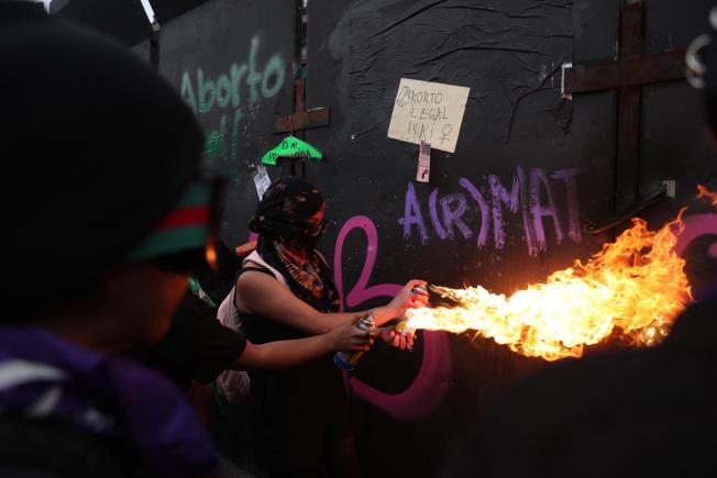 28/09/2022. Diverses dones de col·lectius feministes intenten cremar una tanca metàl·lica durant unes manifestacions pel Dia d'Acció Global per un avortament legal i segur, a Ciutat de Mèxic. Centenars de dones van demanar que es faci efectiu l'accés a l'avortament a tot el país. / Foto: Sáshenka Gutiérrez.