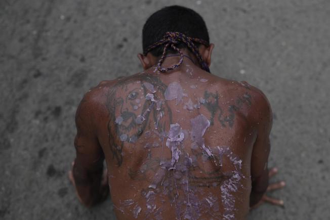 21/10/2022. Un home s'arrossega com a penitència durant el seu pelegrinatge a l'Església de Sant Felip per rendir culte al Crist Negre de Portobelo. Claudio Morán Salas, un panameny de 33 anys, va sortir de la localitat de Nuevo San Juan carregant una creu d'uns tres metres rumb a Portobelo, on va arribar per agrair al Crist Negre perquè té salut i una família unida. / Foto: Benvingut Velasco.