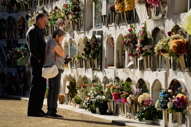 01/11/2022. Dues persones visiten un cementiri a Barcelona, Dia de Tots Sants. / Foto: Enric Fontcuberta.