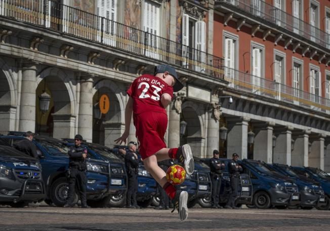 15/03/2023. Un aficionat del Liverpool fa malabars amb la pilota al centre de Madrid, hores abans del partit de Lliga de Campions que el seu equip disputa contra el Reial Madrid a l'estadi Santiago Bernabéu. / Foto: Fernando Villar / Efe.