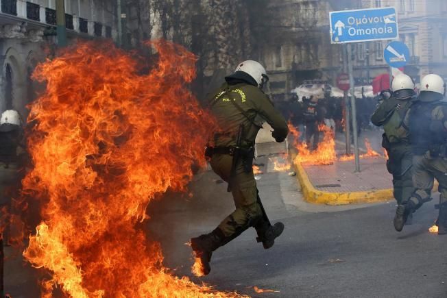 16/03/2023. Manifestants s'enfronten amb la policia antiavalots al final d'una concentració després d'un accident de tren mortal, al centre d'Atenes. Els sindicats del sector públic i privat de Grècia van demanar un 24- hora de vaga nacional per reclamar que s'assignin responsabilitats als responsables de la col·lisió mortal del tren Tempi el 28 de febrer. / Foto: Orestis Panagiotou / Efe.