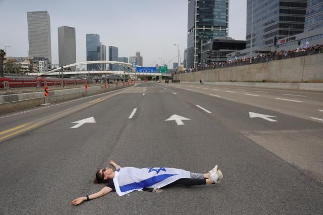 23/03/2023. Una manifestant bloqueja l'autopista Ayalon durant una marxa contra la reforma del sistema de justícia prevista pel govern israelià, a Tel Aviv. S'han dut a terme protestes antigovernamentals a tot el país durant 12 setmanes seguides pel pla del govern israelià de reformar el sistema de justícia i limitar el poder de la Cort Suprema. / Foto: Obir Sulten / Efe.