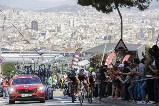 26/03/2023. El ciclista eslovè del Jumbo -Visma Primoz Roglic, el ciclista belga del Quick Step Remco Evenepoel i el portuguès de l'UAE Emirates Joan Almeida durant la setena i última etapa de la Volta Ciclista a Catalunya amb inici i final a Barcelona. / Foto: Quique García / Efe.