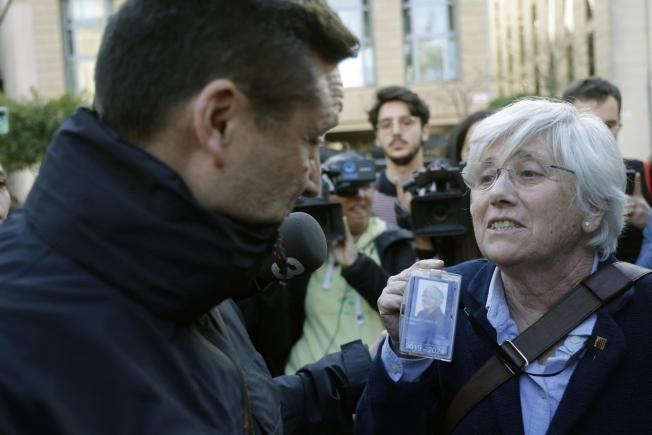 28/03/2023. L'eurodiputada de JxCat Clara Ponsatí, exconsellera del Govern de Carles Puigdemont que va fugir després de la declaració unilateral d'independència del 2017, és detinguda per un mosso d'esquadra mentre ensenya la seva acreditació d'eurodiputada, plaça de la Catedral de Barcelona, després d'haver creuat la frontera francoespanyola per tornar a Catalunya, sense entregar-se a les autoritats malgrat el seu ordre de detenció. / Foto: Quique Garcia / Efe.