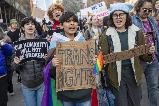 31/03/2023. Diverses persones marxen per mostrar el seu suport a la comunitat transgènere avui, el Dia de la Visibilitat Trans durant un míting a Nova York (EUA). El Dia de la Visibilitat Trans és un esdeveniment anual dedicat a celebrar les persones transgènere i crear consciència sobre la discriminació que enfronten les persones transgènere a tot el món. Foto: Sarah Yenesel / EFE