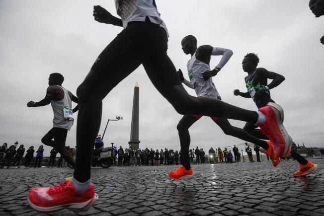 02/04/2023. Corredors passen al costat de l'Obelisc de Luxor durant la seva participació a la marató de París 2023, a la capital francesa, a menys de 500 dies de la celebració dels Jocs Olímpics a la ciutat. / Foto: Yoan Valat / Efe.