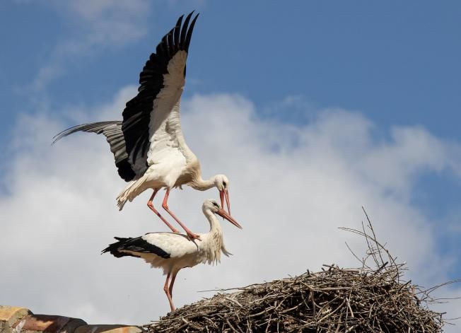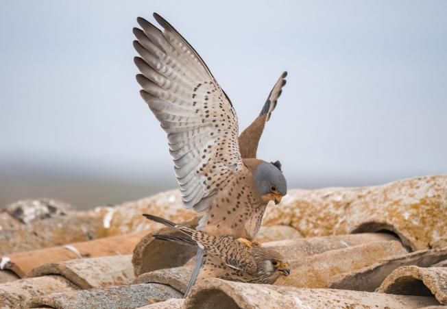 03/04/2023. Còpula d'una parella de xoriguers petits (Falco naumanni) a l'entorn de la Llacuna del Taray, la falcònida més petita d'Europa, per sota del seu parent, el xoriguer vulgar. Aquestes aus migratòries arriben a la primavera (estivals) procedents del continent africà per reproduir-se. Aquesta espècie presenta un acusat declivi, està catalogada com a "vulnerable" al llibre Rojo de les Aus d'Espanya, ja que presenta una gran pèrdua d'hàbitat i veu minvades les seves fonts d'alimentació per diverses tècniques agrícoles com l'ús de pesticides, plaguicides, etc. El pròxim mes de maig se celebra el dia mundial de les aus migratòries, de la qual els xoriguers petits són un clar exemple. / Foto: Annaïs Pascual / Efe.
