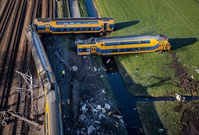 04/04/2023. Lloc on un tren nocturn ha descarrilat, a Voorschoten. Una persona ha mort i diverses persones van resultar greument ferides després que un tren de passatgers va xocar amb equips de construcció a les vies. Un tren de càrrega també va estar involucrat en l'accident. / Foto: Remko de Waal / Efe.