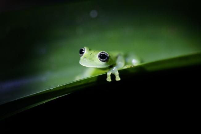 05/04/2023. Una granota de vidre maragda (Espadarana prosoblepon) és vista a la reserva de Chuchantí, a Darién. A l'àrea de reserva hi ha més de 40 càmeres trampa, vint al dosser, la capa de branques i fulles formada per les copes d'arbres veïns i les altres al sotabosc, la varietat de vegetació que creix a les zones més properes al sòl. La idea és recollir les dades que permetin entendre "la dinàmica" d'aquest bosc neotropical. / Foto: Bienvenido Velasco / Efe.