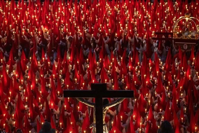 05/04/2023. Centenars de confrares durant el jurament del Silenci davant el Crist de les Injúries al Dimecres Sant, a Zamora. Abans de començar la processó del Silenci de la Reial Confraria del Santíssim Crist de les Injúries, els natzarens de la germandat s'agenollen davant el Crist de les Injúries per jurar el seu silenci al llarg de tot el recorregut processional. La imatge del Crist és una obra del segle XVI, en fusta, de mida una mica més gran que la natural i que representa Crist crucificat ja mort. Avui dia se'n desconeix l'autoria. / Foto: Emilio Fraile / Europa Press.