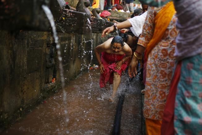 13/04/2023. Una dona hindú pren un bany sagrat en una processó religiosa durant el festival Gajan a Calcuta. El festival hindú té una durada d'un mes, finalitzant amb el començament de l'Any Nou bengalí a l'abril, i celebra la unió del sol i la terra. / Foto: Piyal Adhikary / Efe.