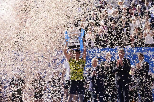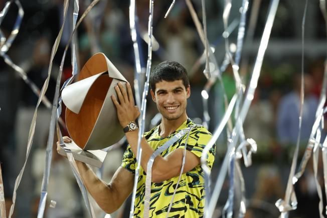 07/05/2023. El tennista espanyol Carlos Alcaraz posa amb el trofeu després de la seva victòria davant l'alemany Jan-Lennard Struff a la final del Mútua Madrid Open disputat a la Caixa Màgica, a Madrid. / Foto: Chema Moya / Efe.