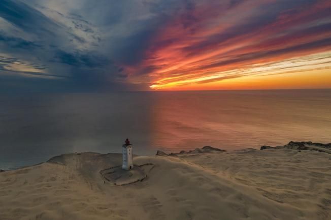 05/05/2023. El far de Rubjerg Knude a la costa del Mar del Nord a Hjoerring, nord de Dinamarca. Amenaçada per l'augment del nivell del mar, la torre, construïda el 1990, es va allunyar de la costa sobre rails especialment construïts el 2019 per evitar-ne el col·lapse. La reubicació 70 metres terra endins es va dur a terme lliscant l'estructura sobre vies i va trigar sis setmanes a completar-se. / Foto: Gyorgy Varga / Efe.