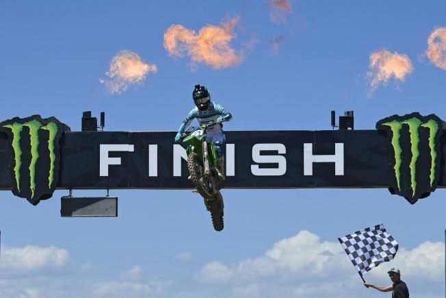 06/05/2023. La pilot Courtey Duncan, primera a la seva mànega de classificació, travessa la meta durant el Gran Premi d'Espanya de Motocross, al circuit de Arroyomolinos (Madrid). / Foto: Víctor Lerena / Efe.