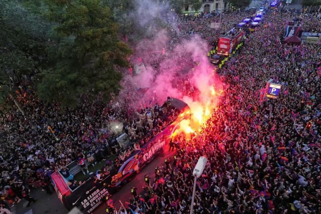 15/05/2023. Els jugadors i jugadores del FC Barcelona celebren la conquesta de LaLiga Santander per part de l'equip masculí i de la Finetwork Lliga F del primer equip femení amb la tradicional rua pels carrers de la capital catalana. / Foto: Alejandro García. / Efe.
